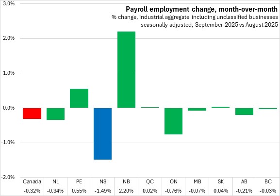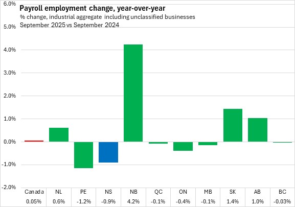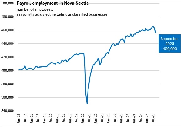 Compared with the same month in 2024, Nova Scotia's payroll employment dropped by 0.9% (-4,190) in September 2025. Nationally, payroll employment edged up 0.05% despite six provinces reported decline, with the fastest declines in Prince Edward Island and Nova Scotia. The fastest gain was reported in New Brunswick.