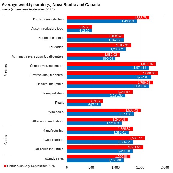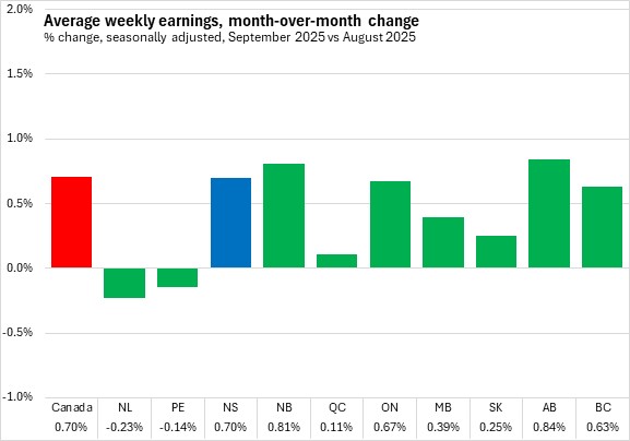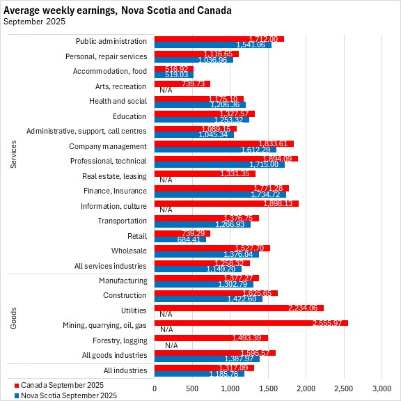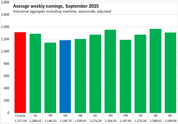 Nova Scotia's average weekly earnings in September 2025 were second lowest among provinces, ahead of Prince Edward Island. Alberta reported the highest average weekly earnings.
