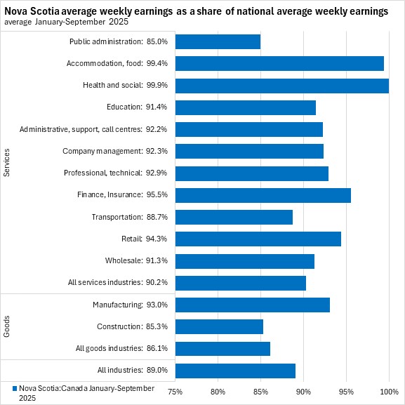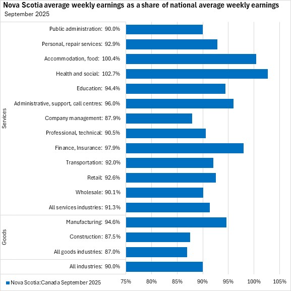 In September 2025, Nova Scotia's average weekly wages were 90.0% of the national average. Nova Scotia average weekly wages were below the comparable national average for every industry except health/social assistance and accommodation/food services. The largest gap was reported in construction (87.5% of the national average).
