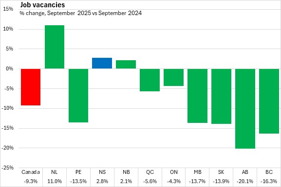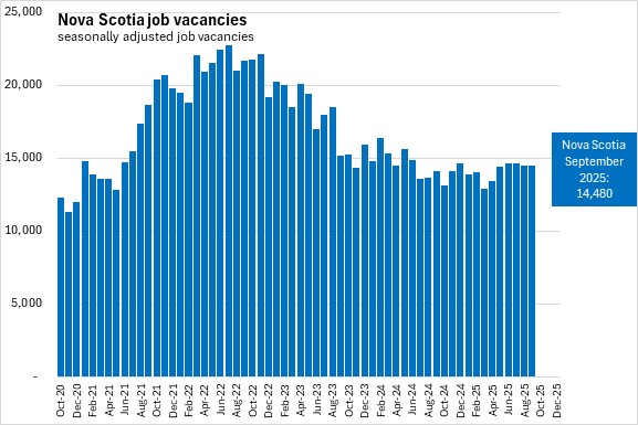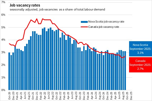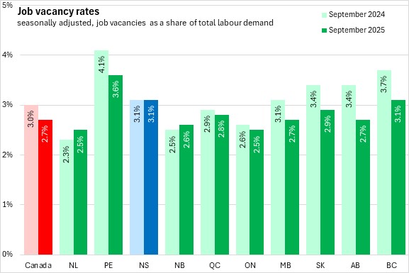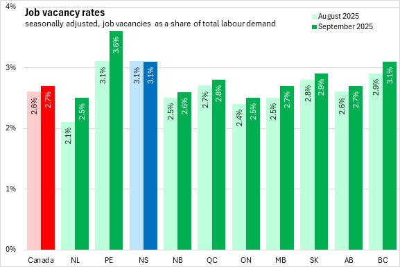 Nova Scotia had 14,480 job vacancies in September 2025 with a vacancy rate of 3.1%, unchanged from the previous month.
