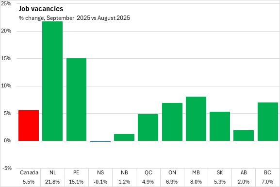 Canadian employers were actively recruiting for 486,025 positions in September with the national job vacancy rate of 2.7%, up from 2.6% in August. All provinces except Nova Scotia reported higher job vacancy rates in September. The lowest vacancy rates were in Newfoundland and Labrador and Ontario.