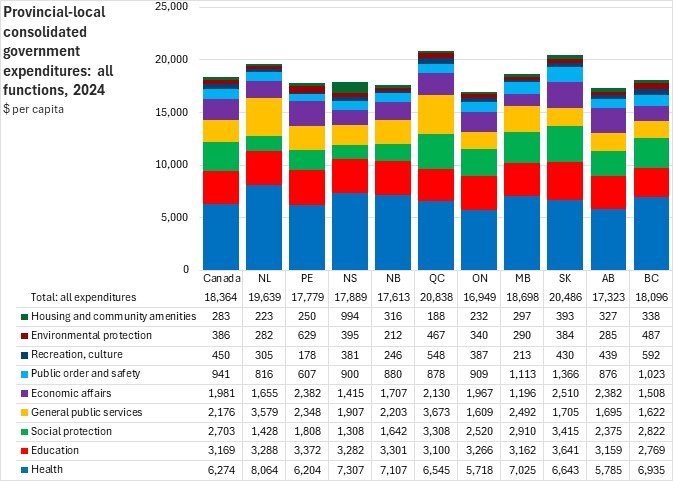 November 27, 2025GOVERNMENT EXPENDITURE BY FUNCTION, 2024 Statistics Canada has published details from Consolidated Government Finance Statistics for 2024 including consolidated results for provincial-territorial and local governments by nine functional areas of expenditure: health care, education, social protection, general public service (which includes debt payments), economic affairs (which includes transportation), public order/safety, environmental protection (which includes wastewater and solid waste), housing/community amenities (which includes water services) and recreation/culture.