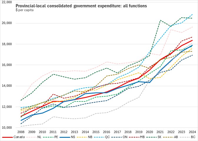 Total per capita expenditures by provincial-local government function added up to $17,889 in Nova Scotia, which was $475 (2.6%) below the national average of $18,364 per capita. Saskatchewan ($20,486 per capita) and Québec ($20,838 per capita) reported the highest expenditures per capita while Ontario ($16,949 per capita) had the lowest.