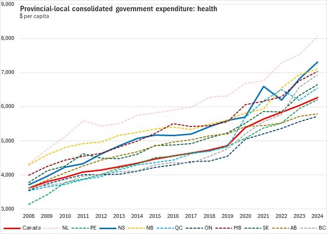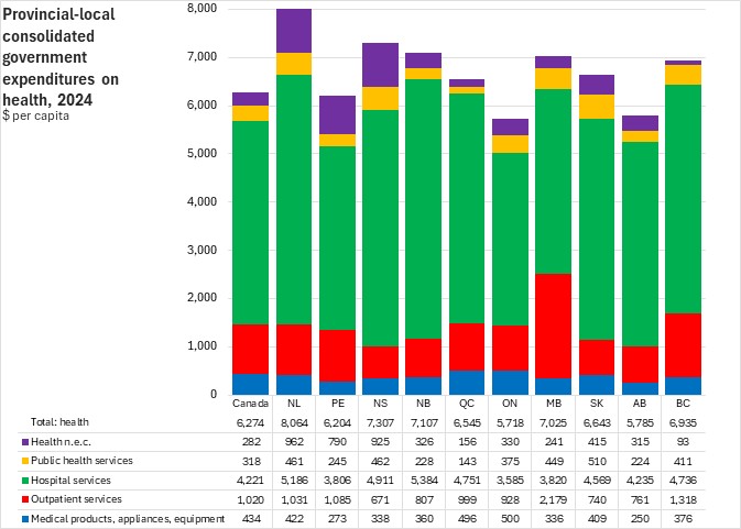 Health care makes up the largest per capita expenditure function in every provincial-local government. Nova Scotia's health expenditures of $7,307 per capita were second highest among provinces after Newfoundland and Labrador ($8,064 per capita). The national average for health expenditures was $6,274 per capita.