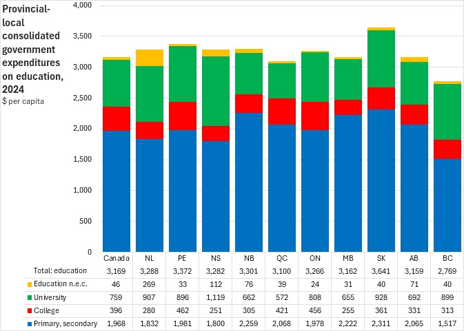 Nova Scotia's spending on universities ($1,119 per capita) was the highest among provinces while its expenditures for primary/secondary education ($1,800 per capita) were the second lowest among provinces. Per capita education spending was highest in Saskatchewan ($3,641 per capita) and lowest in British Columbia ($2,769 per capita).