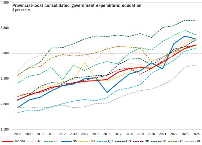 Education is the second largest functional expenditure made by provincial-local governments. Nova Scotia's education spending of $3,282 per capita was above the national average among provincial-local governments ($3,169 per capita).