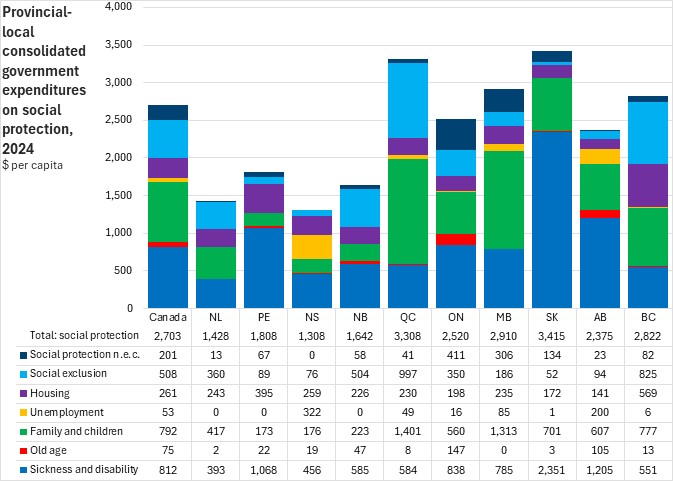 Provincial-local government consolidated expenditures on social protection amounted to $1,308 per capita in Nova Scotia - lowest among provinces. The national average provincial-local expenditure on social protection was $2,703 per capita, but expenditures on social protection exhibit a wide variation across provinces with over $2,100 per capita difference from the lowest spending provincial-local government (Nova Scotia) to the highest (Saskatchewan). Some of this variation is explained by markedly different service levels across provinces. For example, Saskatchewan's higher payments for sickness and disability are attributable to benefits provided under that province's public auto insurance program.