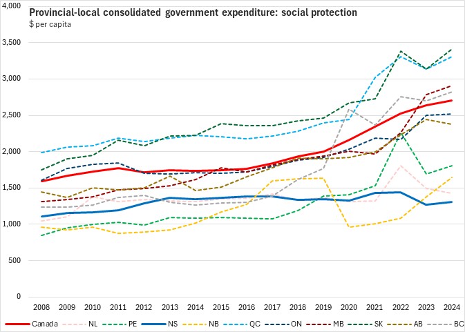 Consolidated provincial-local expenditures on social protection increased by 2.8% (+$36 per capita) in Nova Scotia from 2023 to 2024, but this was only a partial rebound from the reduction in 2023.