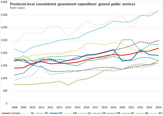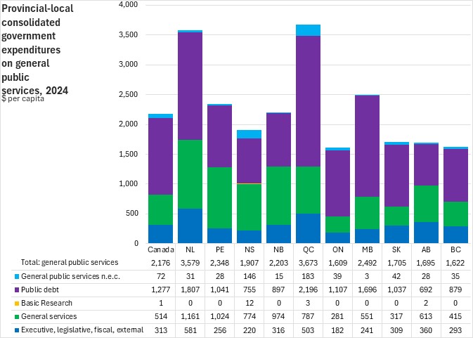 General public service expenditures (consolidated provincial-local) were $1,907 per capita in Nova Scotia, which was below the national average of $2,176 per capita. Nova Scotia's general public service expenditures included $755 per capita in public debt transactions (second lowest among provinces), $774 per capita in general provincial-local government services (above the national average), $220 per capita in executive/legislative/financial/fiscal affairs (second lowest among provinces) and $12 per capita in basic research (highest among provinces). The highest expenditures on general public services were in Newfoundland and Labrador ($3,579 per capita) as well as Québec ($3,673 per capita). The lowest general public service expenditures were in Ontario ($1,609 per capita) and British Columbia ($1,622 per capita).