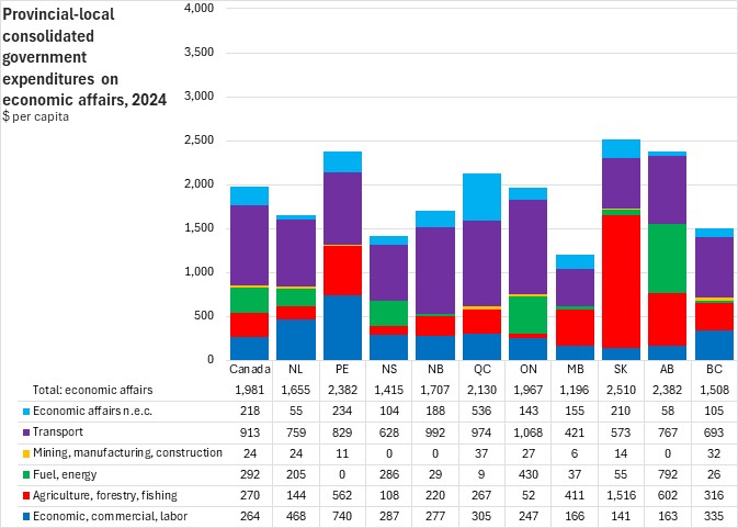 The economic affairs functional category includes expenditures in a wide range of activities. Transportation is the largest provincial-local exepnditure on economic affairs across Canada, but it is not the largest expenditure in Saskatchewan where supports for agriculture, forestry, fishing, hunting and were larger, or Alberta, where supports for fuel/energy was larger.