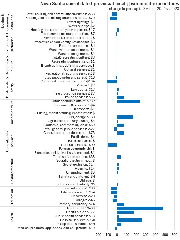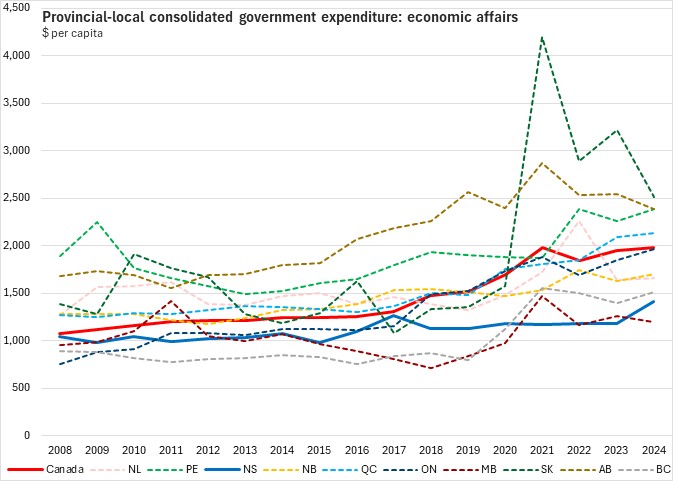 In 2024, Nova Scotia's consolidated provincial-local expenditures on economic affairs increased by 20.2% or +$237 per capita - the largest gain among provinces.