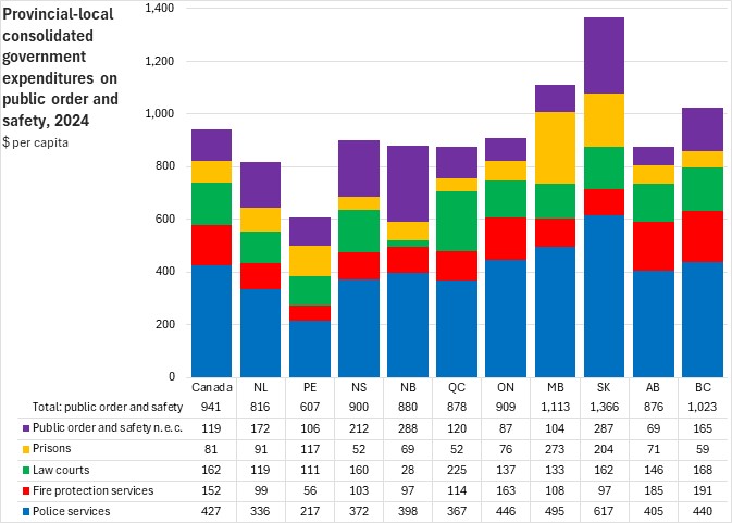 Expenditures on public order and safety were $941 per capita in Canada and $900 per capita in Nova Scotia in 2024. Police services ($372 per capita - below the national average) made up the largest part of these expenditures in Nova Scotia, followed by law courts ($160 per capita - just below the national average) and fire protection services ($103 per capita - below the national average). Nova Scotia's expenditures on prisons ($52 per capita) were tied for the lowest among provinces with Québec. The highest expenditures on public order and safety were reported in Saskatchewan ($1,366 per capita). The lowest expenditures on public safety were in Prince Edward Island ($607 per capita).