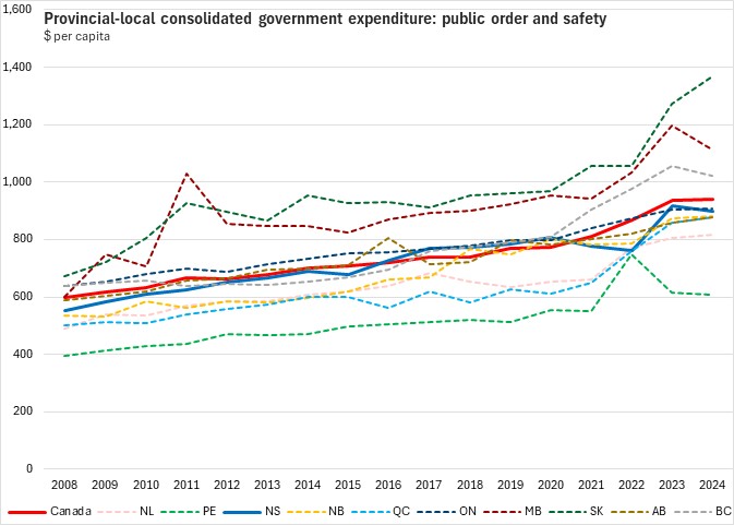Nova Scotia's consolidated provincial-local expenditures on public order and safety decreased by 1.7% or -$16 per capita from 2023 to 2024, after a sharp rise in 2023. Across Canada, public order and safety expenditures were up 0.4% or +$3 per capita. The largest increases in public order and safety spending were reported in Saskatchewan (+7.5% or +$96 per capita). Manitoba reported the steepest per capita decline in public order and safety spending (-7.0% or -$84 per capita).