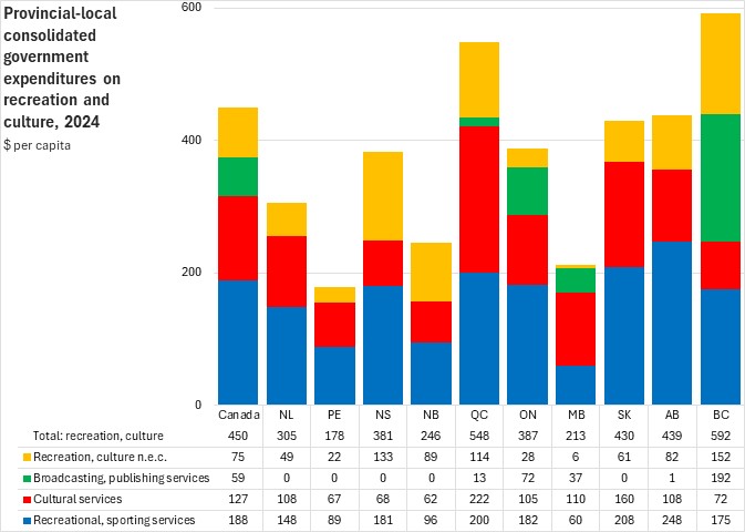 Spending on recreation and cultural services was $450 per capita across Canada and $381 per capita in Nova Scotia. Recreation and culture spending was higher in British Columbia ($592 per capita), which has a larger expenditure on broadcasting/publishing services. Prince Edward Island ($178 per capita) had the lowest spending on recreation and cultural services.