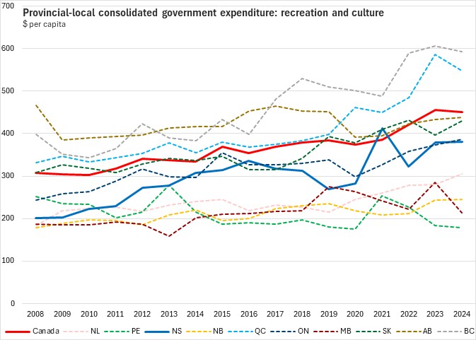 National consolidated provincial-local spending on recreation and culture was down 1.3% or -$6 per capita from 2023 to 2024. Nova Scotia's expenditures on recreation and culture increased by 0.7% or +$3 per capita. The largest decline was reported in Manitoba (-25.4% or -$72 per capita) while Newfoundland and Labrador (+9.0% or +$25 per capita) and Saskatchewan (+8.5% or +$34 per capita) reported the largest increases.