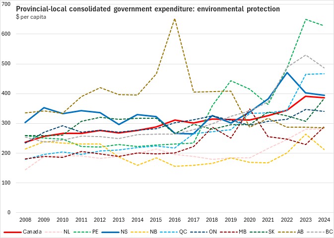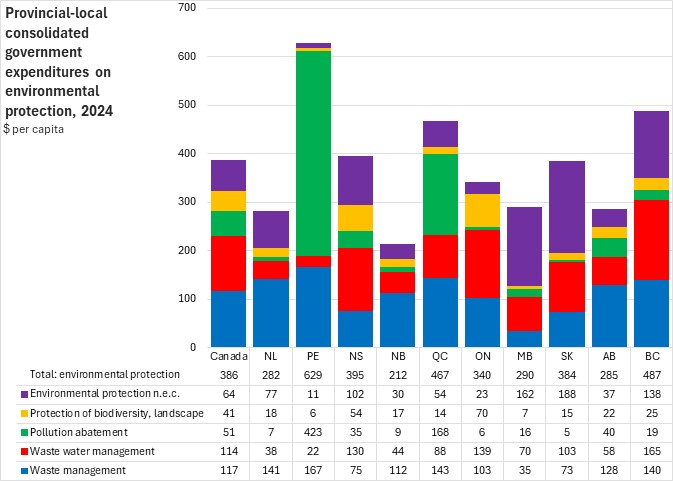 National consolidated provincial-local spending on environmental protection was $386 per capita in 2024. Nova Scotia's expenditures on environmental protection were $395 per capita.