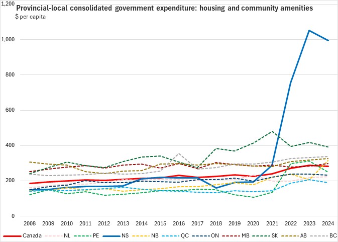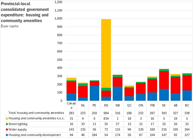 Consolidated provincial-local spending on housing and community amenities amounted to $283 per capita nationally and $994 per capita in Nova Scotia. For the third consecutive year, Nova Scotia's 2024 expenditures on housing and community amenities featured unusually large spending in unclassified activities ($834 per capita). Provision of water supply typically makes up the largest part of housing/community amenity spending in most provinces. Nova Scotia's expenditures on water supply ($72 per capita) and housing/community development ($54 per capita) were below national averages. Nova Scotia made the highest expenditures on street lighting among provinces ($35 per capita).