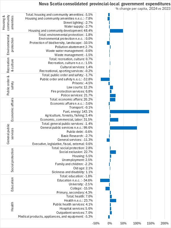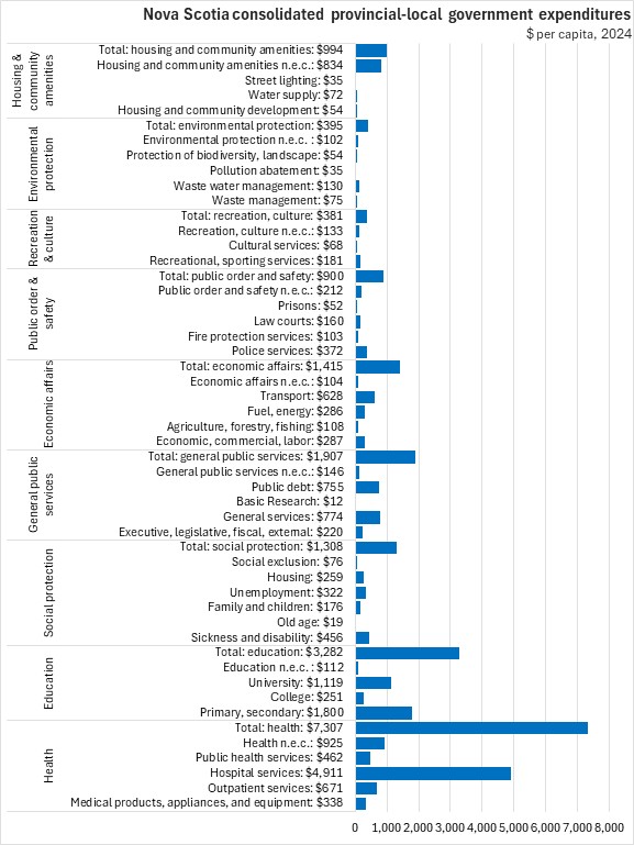 Nova Scotia's largest 2024 consolidated provincial-local expenditures were in: hospital services, primary/secondary education, universities, general services, public debt and unclassified housing/community amenities.