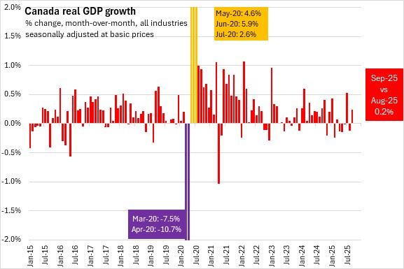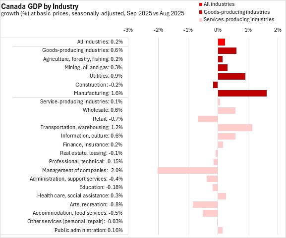 Real Gross Domestic Product (GDP) in Canada grew by 0.2% in September 2025, with gains in both goods and services producing industries.