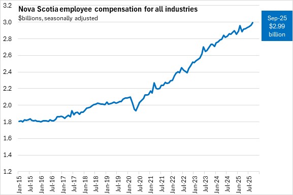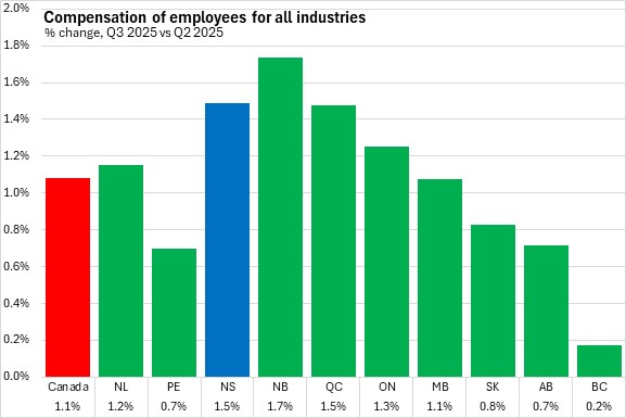 Total compensation of employees for all industries increased by 1.5% in Nova Scotia, rising to $8.90 billion in Q3 2025. National employee compensation was up 1.1% in the third quarter of 2025. All provinces recorded quarter over quarter gains in employee compensation with the fastest growth in New Brunswick, followed by Nova Scotia and Québec. The slowest growth over Q2 was in British Columbia.