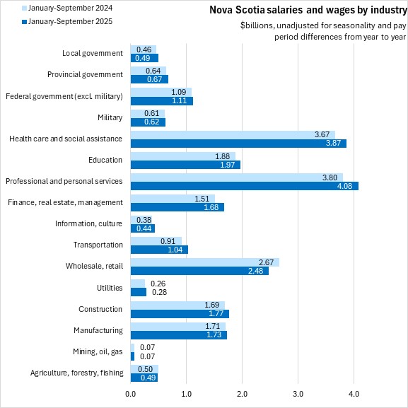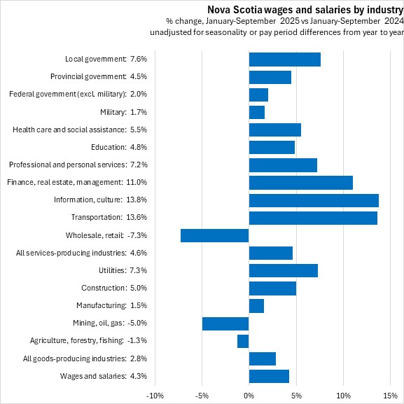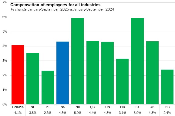 Nova Scotia's employee compensation for all industries was up 4.3% in the first three quarters of 2025 when compared with the same period of 2024. National employee compensation grew 4.1%. All provinces recorded year-to-date gains in employee compensation in the first three quarters of the year, with the fastest gain reported in New Brunswick and Saskatchewan and the slowest in Prince Edward Island.