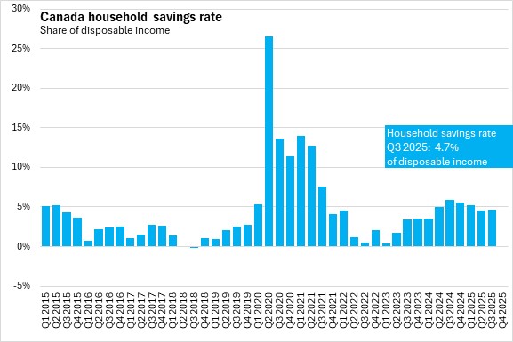 Including mixed income from unincorporated businesses, property income (such as interest and dividends from financial assets), current transfers (such as CPP and EI) with employee compensation, Canada's overall household income grew at a seasonally adjusted annualized rate of 3.9% in Q3 2025.