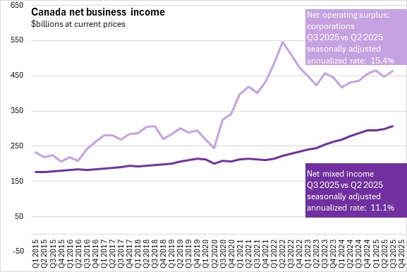 Net operating surplus for corporations grew at a 15.4% seasonally adjusted annualized rate, as rebounding oil and gas output increased income for non-financial corporations. Net mixed income of unincorporated businesses was up 11.1% in Q3.