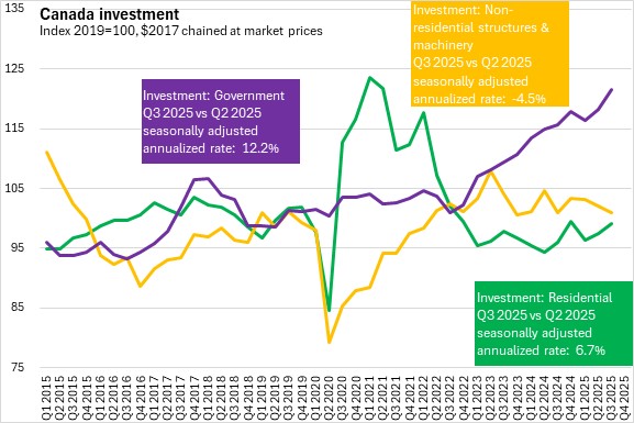 Non-residential investment fell by 4.5% in Q3 on lower investment in machinery and equipment, non-residential buildings and intellectual property products, while government investment was up 12.2% in Q3 2025.
