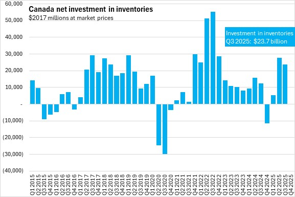 Investment in inventories was $23.7 billion in Q3 2025, down from $27.6 billion in Q2. Slowdowns in business inventory accumulation were notable in manufacturing, transportation and communication, and utilities.