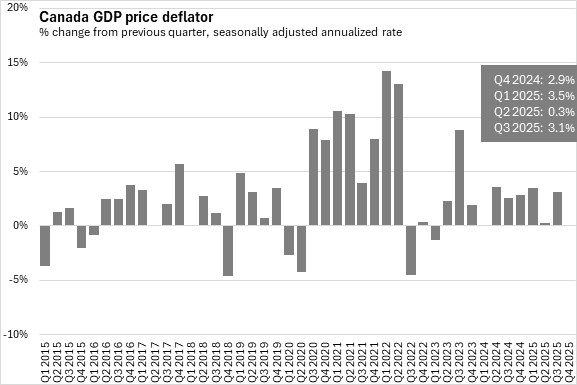 Employee compensation (measured in current prices, not real volumes) was up by a seasonally adjusted annualized rate of 4.4% in Q3. Wages were up in all industries except federal government public administration excluding military, with growth led by professional and personal services, finance/real estate/company management, and health care/social assistance.