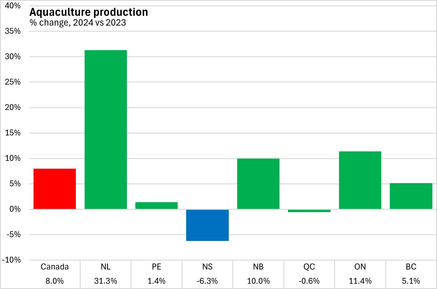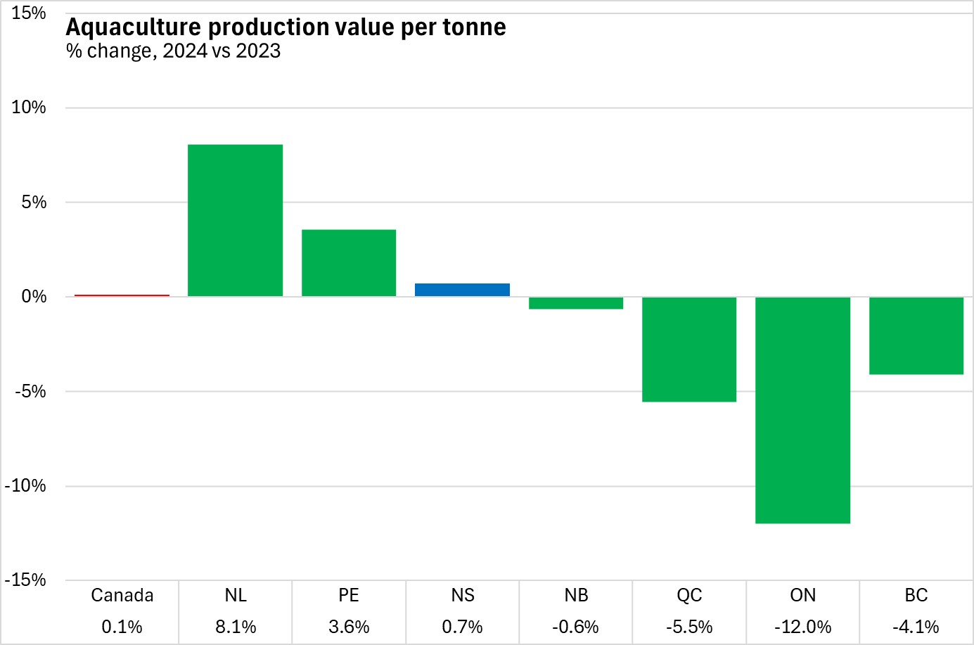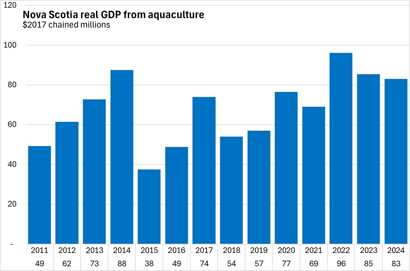 Real GDP in Nova Scotia's aquaculture industry fell by 2.8% in 2024, one of five provinces to report a decline (along with British Columbia, Alberta, Saskatchewan, and Québec).