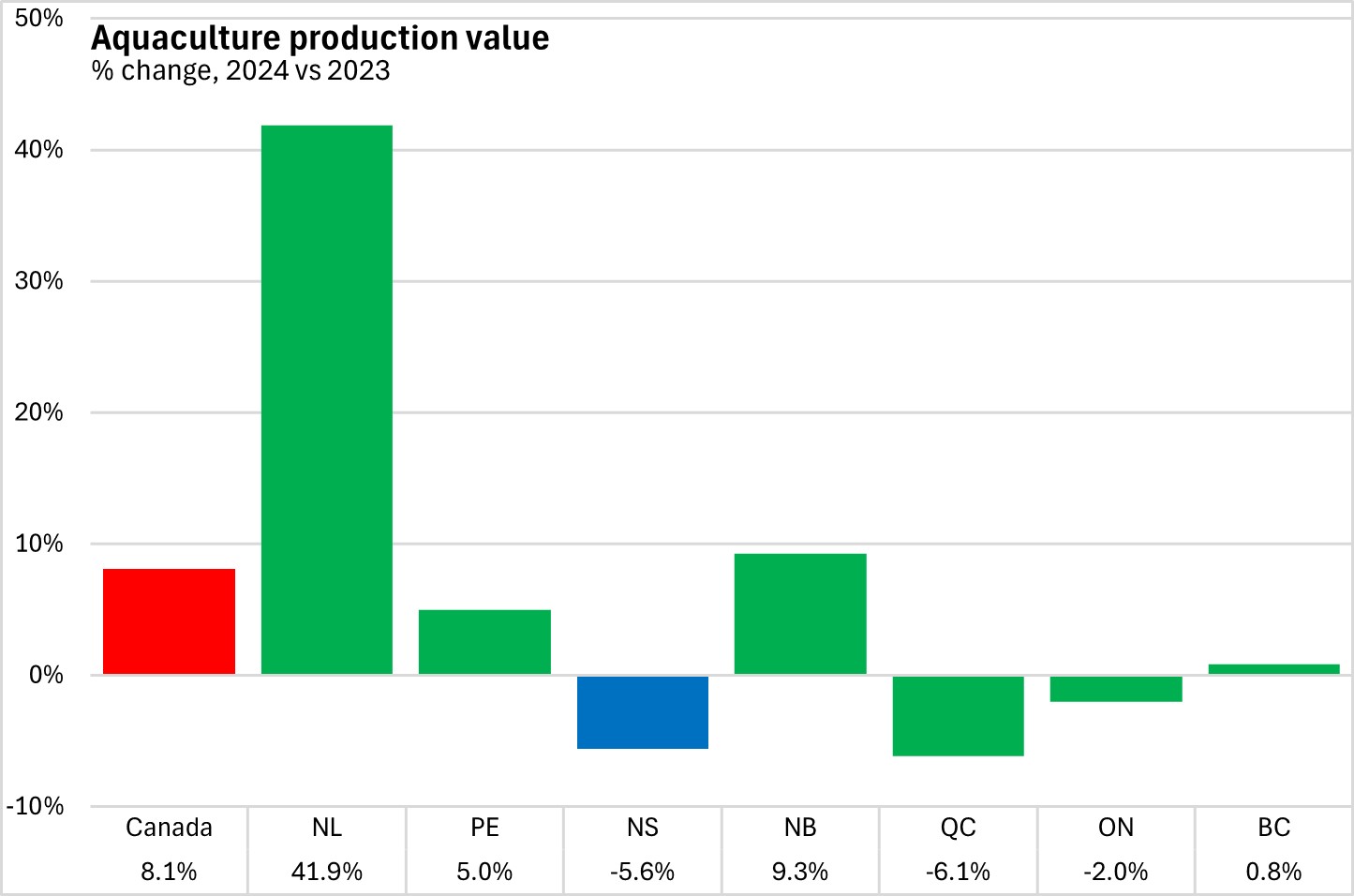 Nova Scotia's aquaculture output value fell by 5.6% to $113.8 million from 2023 to 2024. National aquaculture output value was up (+8.1%) with notable gain in Newfoundland and Labrador and with the most decline in Québec.