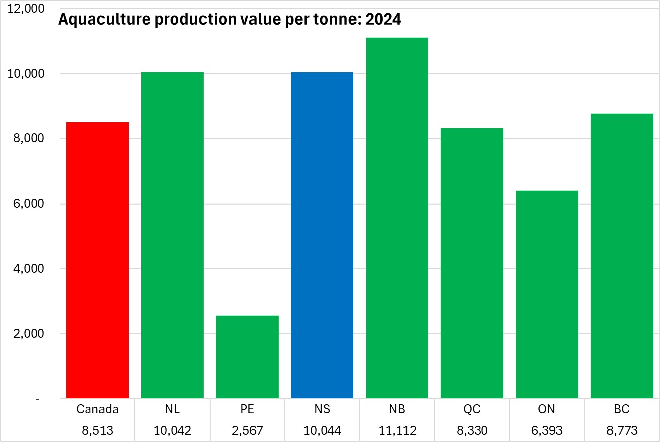 In 2024, the average unit value of Nova Scotia's aquaculture products was above the national average at $10,044 per tonne - the second highest value among provinces after New Brunswick. This was up 0.7% from value per tonne in 2023.