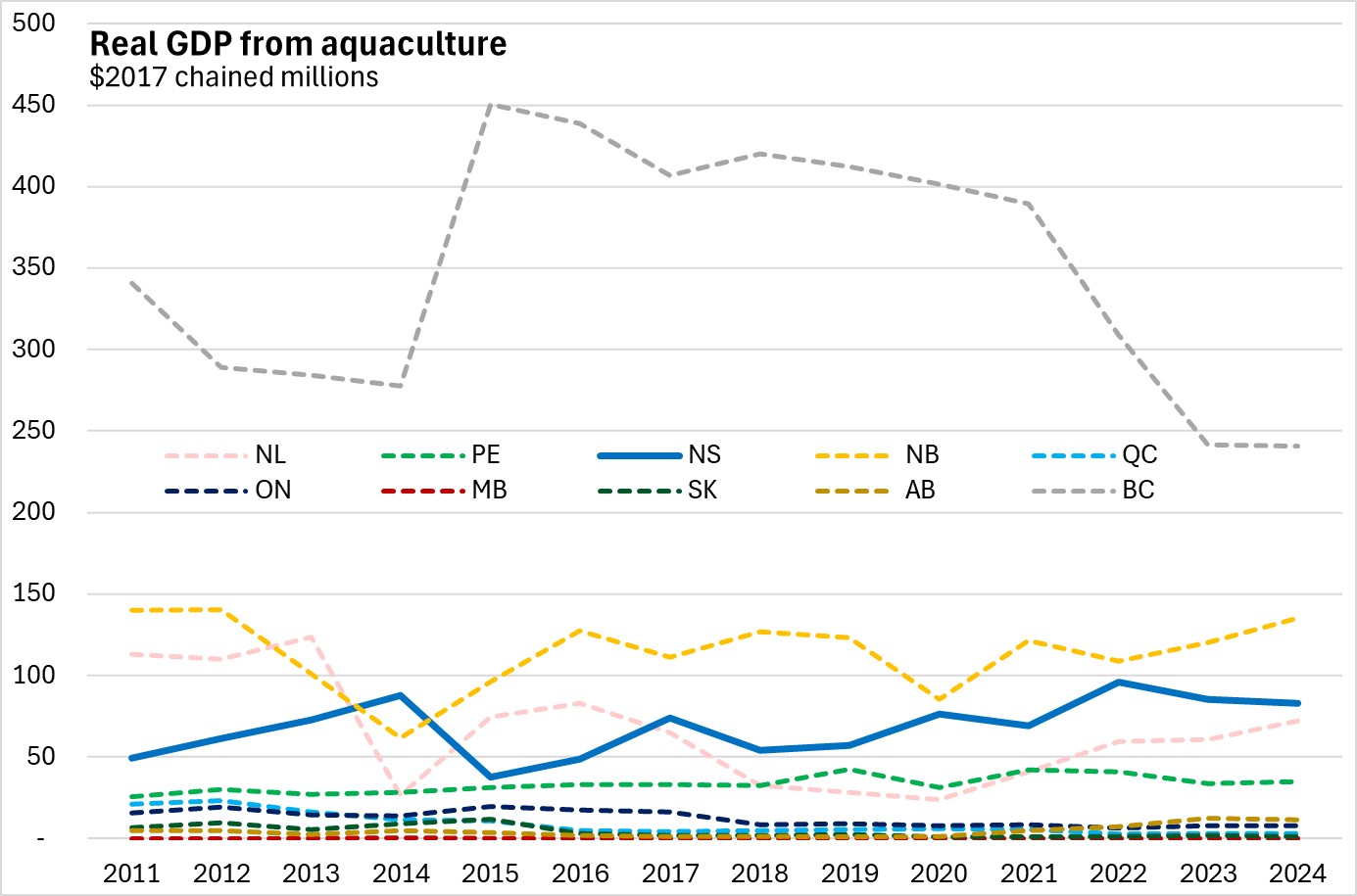 Source: Statistics Canada. Table 32-10-0107-01 Aquaculture, production and value; Table 36-10-0711-01 Gross domestic product (GDP) at basic prices, by industry, provinces and territories (x 1,000,000)
