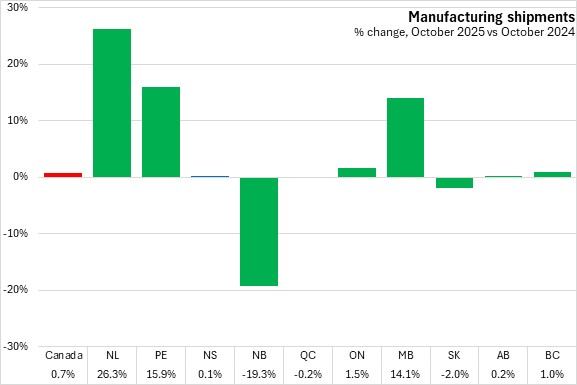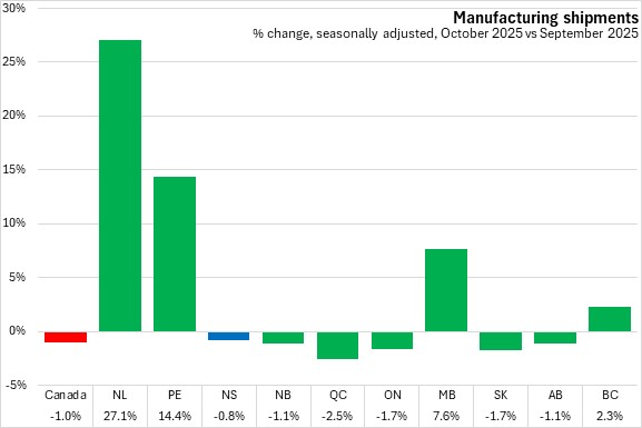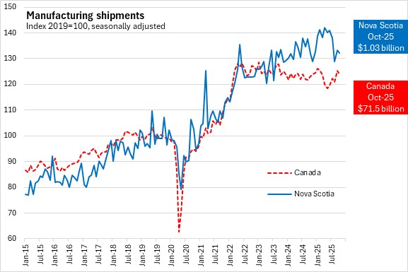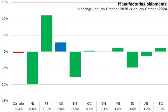 Nova Scotia's manufacturing shipments increased by 2.8% compared to the same period in 2024. National shipments decreased 0.3%. Five provinces reported increases, led by Prince Edward Island. Five provinces led by Newfoundland and Labrador reported declines.