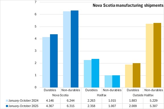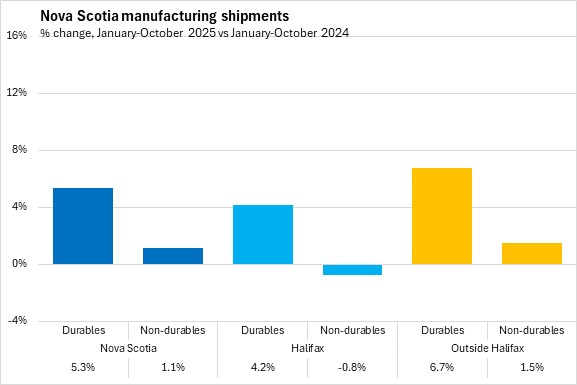 Nova Scotia's year-to-date durable goods shipments increased 5.3%, while non-durable goods shipments increased 1.1% in the same period. In Halifax, durable goods shipments increased 4.2% and non-durables declined 0.8%, year-to-date. Outside Halifax, durables rose 6.7% while non-durables increased 1.5%.