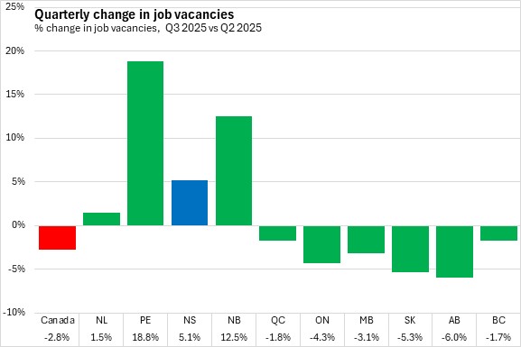The number of job vacancies in Nova Scotia grew by 5.1% from Q2 2025 to Q3 2025. Nationally, job vacancies declined 2.8%, with only the Atlantic provinces reporting growth. The steepest decline was in Alberta while the strongest growth was in Prince Edward Island.