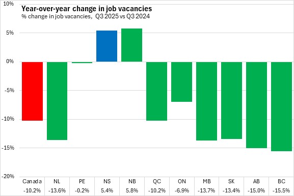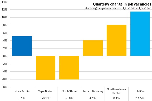 In Nova Scotia, job vacancies were down in Cape Breton and North Shore. The Annapolis Valley, Southern Nova Scotia and Halifax posted gains in job vacancies in the third quarter of 2025, led by Halifax.