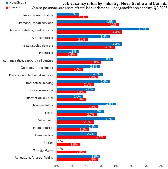 Compared with national averages by industry, Nova Scotia's job vacancy rates were higher for most reporting industries (exceptions: public administration, information/culture, construction).