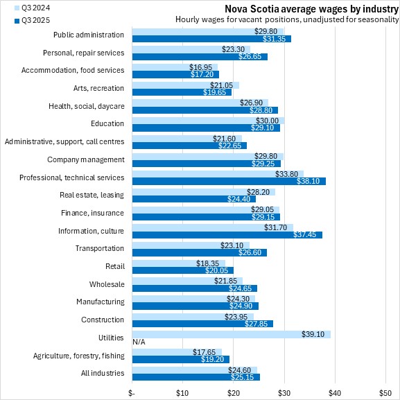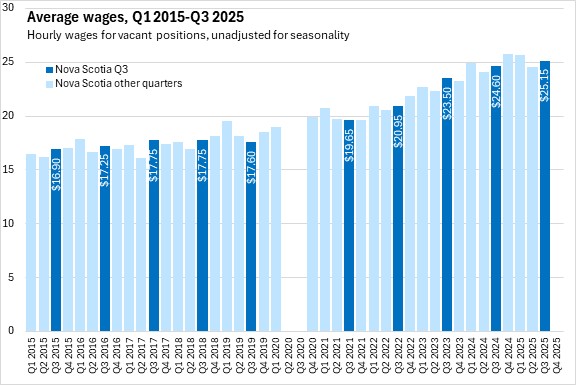 The average hourly wage offered on vacant positions (unadjusted for seasonality) was $25.15 in Nova Scotia during Q3 2025, up from $24.60 a year earlier. All provinces reported higher average hourly wages on vacant positions compared with Q3 2024.