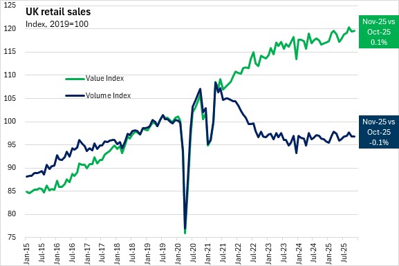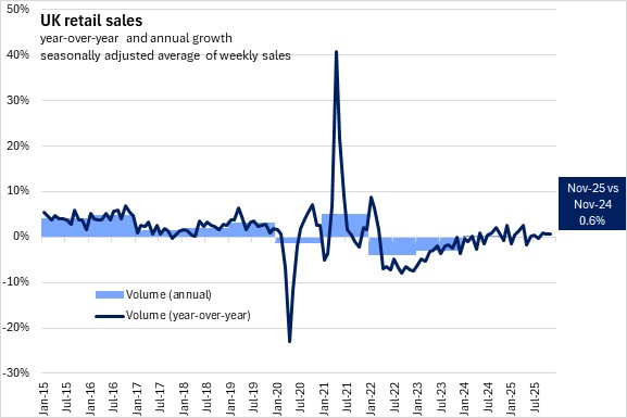 December 19, 2025UK RETAIL SALES, NOVEMBER 2025 Month-over-month (November 2025 vs October 2025, seasonally adjusted)
