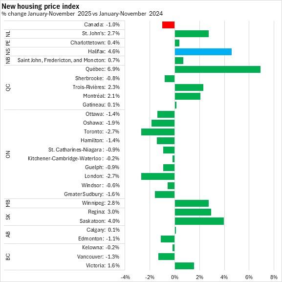 Halifax new housing prices were up 4.6% in January-November 2025 compared to January-November 2024. The fastest growth among CMAs was in Québec City and the fastest declines were in London and Toronto.