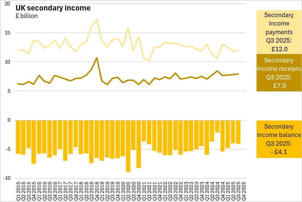 UK secondary income receipts increased by 1.5% (+£119 million) and secondary income payments increased by 1.8% (+£212 million).
