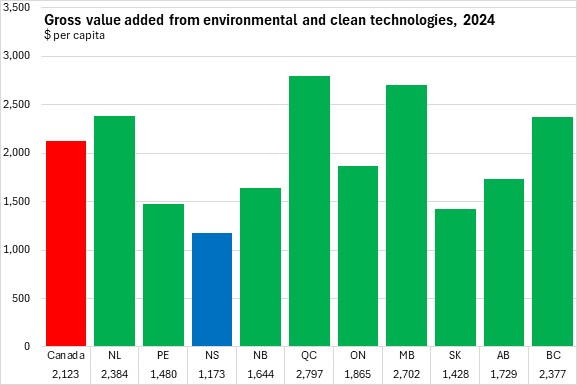 In Nova Scotia the gross value added (at basic prices) generated by the ECT products sector grew 8.5% to $1,270 million in 2024, the fastest gain among provinces (slightly ahead of Saskatchewan). This amounted to $1,173 per capita or 1.9% of gross domestic product (at market prices). Nationally, gross value added from ECT products grew by 2.7% in 2024 with gains in eight provinces. New Brunswick and Manitoba reported declines.