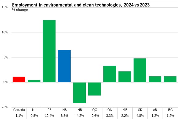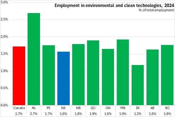 Nova Scotia's employment in ECT industries was 8,352 in 2024 or 1.6% of total employment. Saskatchewan reported the lowest employment shares in ECT (followed by Nova Scotia) while Newfoundland and Labrador reported the highest employment share.