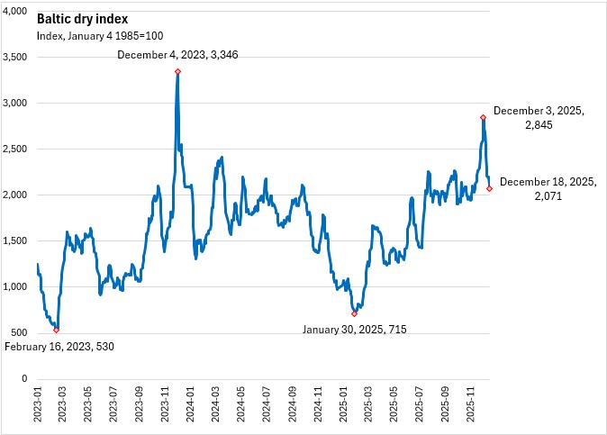 December 31, 2025BALTIC DRY INDEX, DECEMBER 2025 The Baltic Dry Index (BDI) measures procurement costs of shipping raw materials by sea.