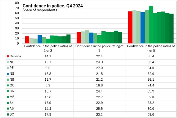 Although high levels of confidence in police persist over time in Nova Scotia, the portion of respondents reporting the lowest levels of confidence in police increased in Q4 2024.