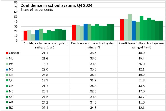 Nova Scotians had lower than average confidence in the school system in Q4 2024 with 42.1% reporting the highest levels of confidence (national: 45.0%). Across Canada confidence in the school system was highest in Prince Edward Island and Lowest in New Brunswick.