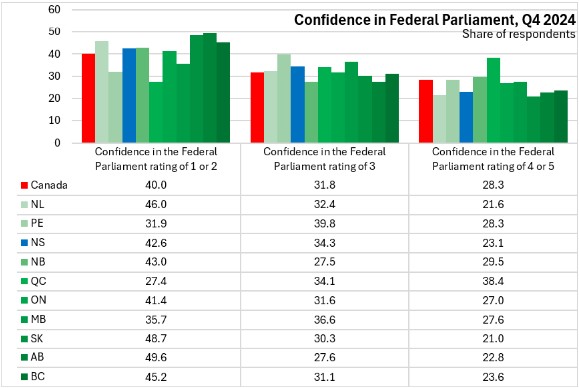 Confidence in Federal Parliament was notably lower than for other institutions. Nova Scotians had a less than average confidence in Canada's Federal Parliament with just 23.1% reporting the highest levels of confidence (national: 28.3%). Confidence in the Federal Parliament was highest in Québec and lowest in Alberta and Saskatchewan.