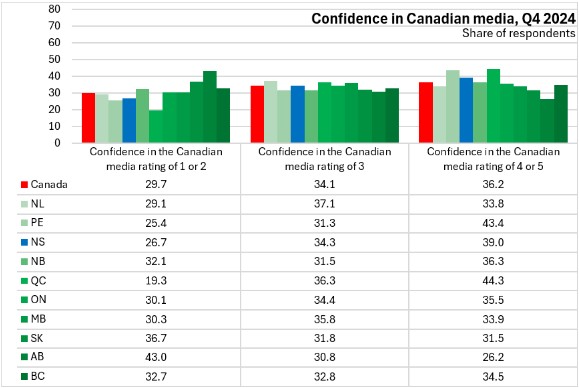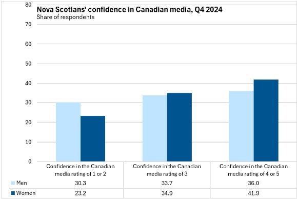 Nova Scotians had higher confidence in Canadian media (43.4% reported the highest levels of confidence) than the national average (36.2%). Confidence in media was highest in Québec and lowest in Alberta.